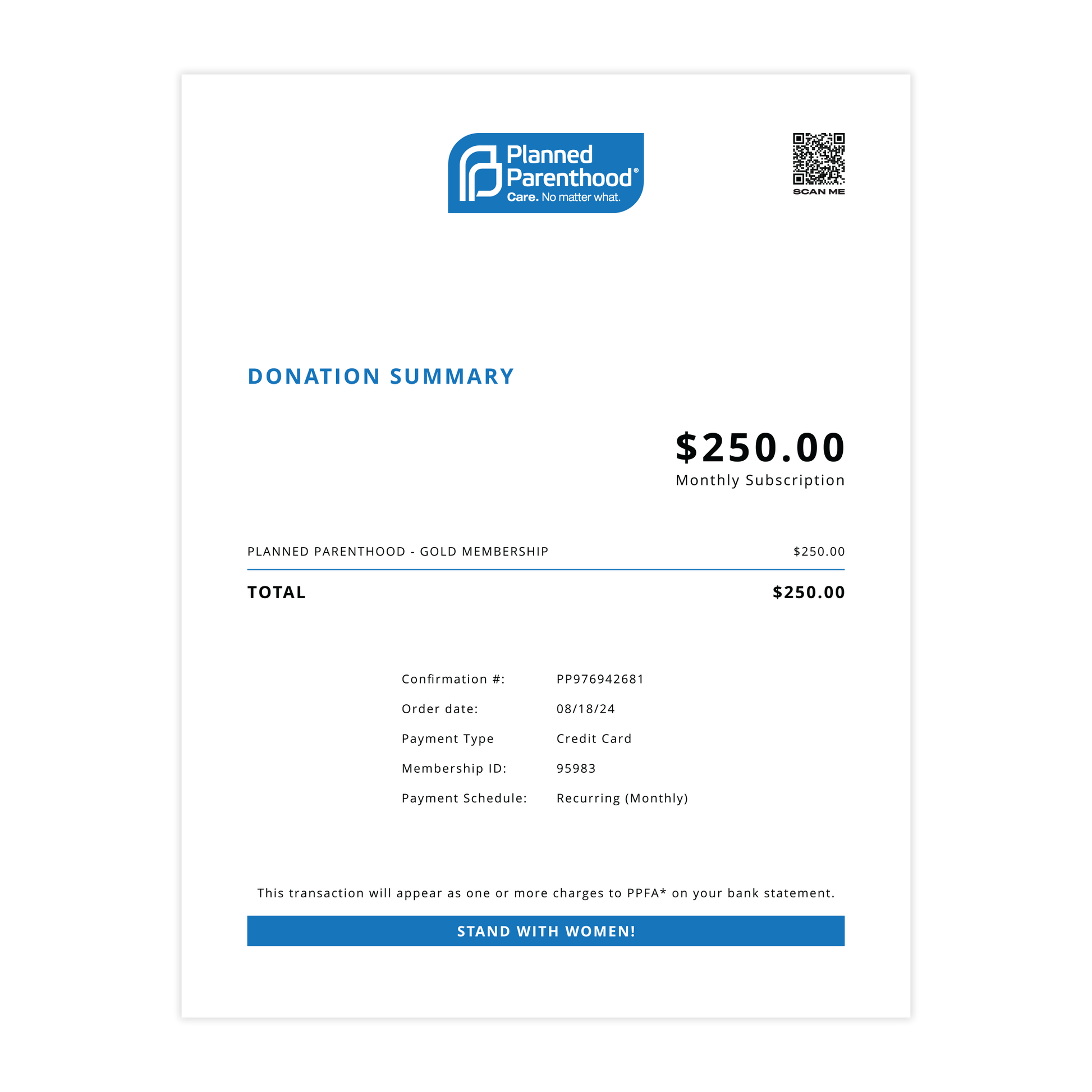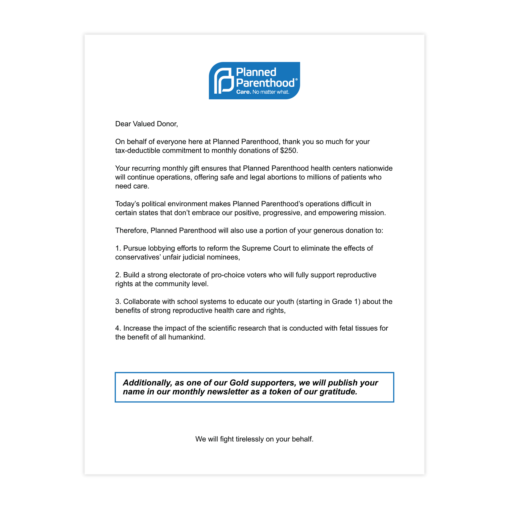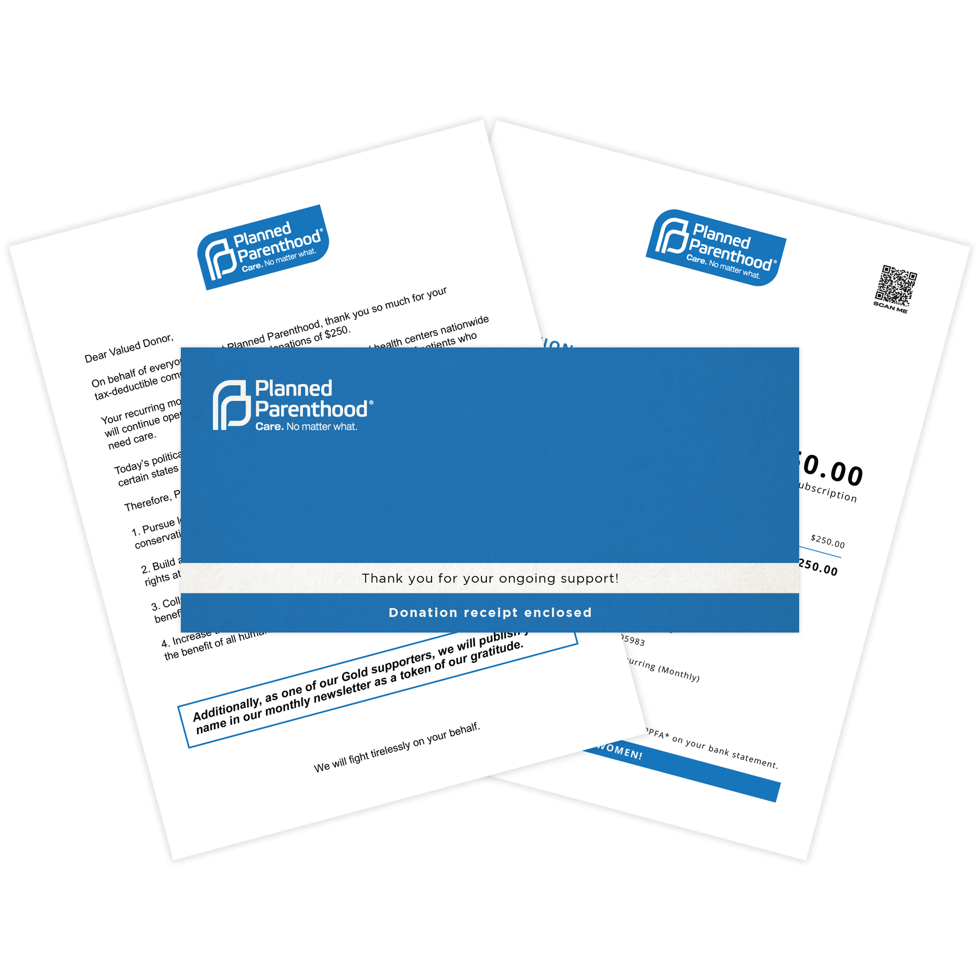 Send your most conservative friend this Planned Parenthood mailer to watch their head explode. They'll be "thanked" for their $250 donation to fund abortions, fight pro-life laws, and educate school children about reproductive rights—because nothing says surprise like being an unexpected champion for women’s health.